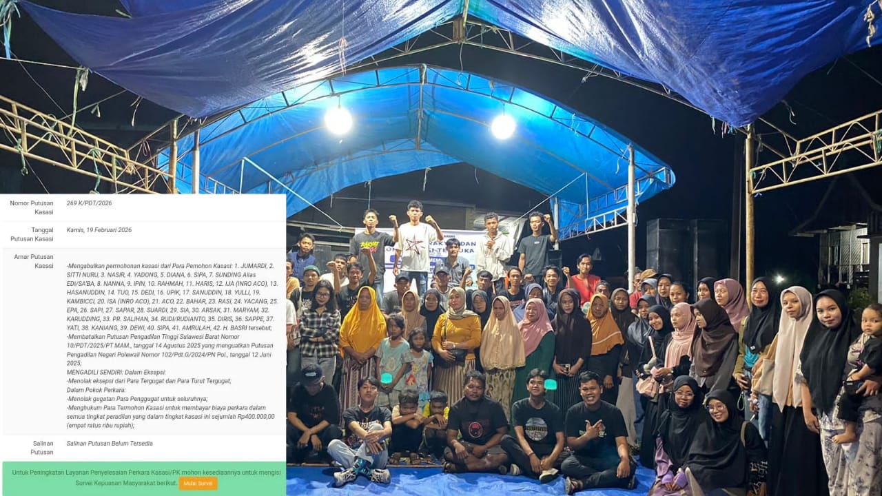 POLMAN, AKARNEWS.ID – Perjuangan panjang puluhan kepala keluarga di Dusun Passairang, Kecamatan Campalagian, Kabupaten Polewali Mandar (Polman) membuahkan hasil manis. Mahkamah Agung (MA) resmi mengabulkan permohonan kasasi warga terkait sengketa tanah yang telah bergulir selama enam tahun terakhir.