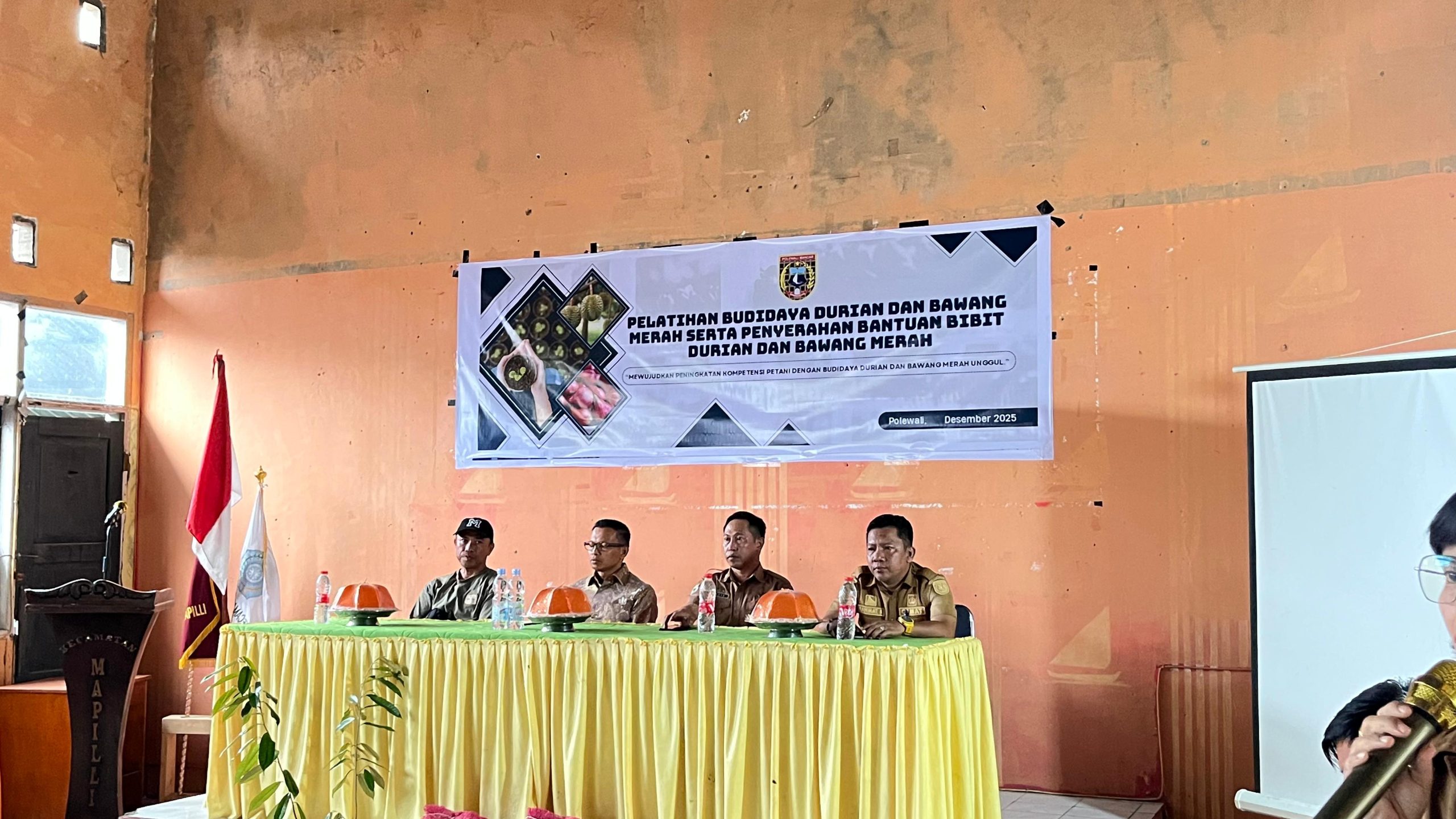 AKARNEWS.ID, POLMAN – Pemerintah Kabupaten Polewali Mandar (Pemkab Polman) melalui Dinas Transmigrasi Tenaga Kerja dan ESDM menggelar pelatihan budidaya durian dan bawang merah, sekaligus menyalurkan bantuan bibit kepada kelompok tani penerima manfaat di Aula Kantor Kecamatan Mapilli, Rabu, (9/12/2025).