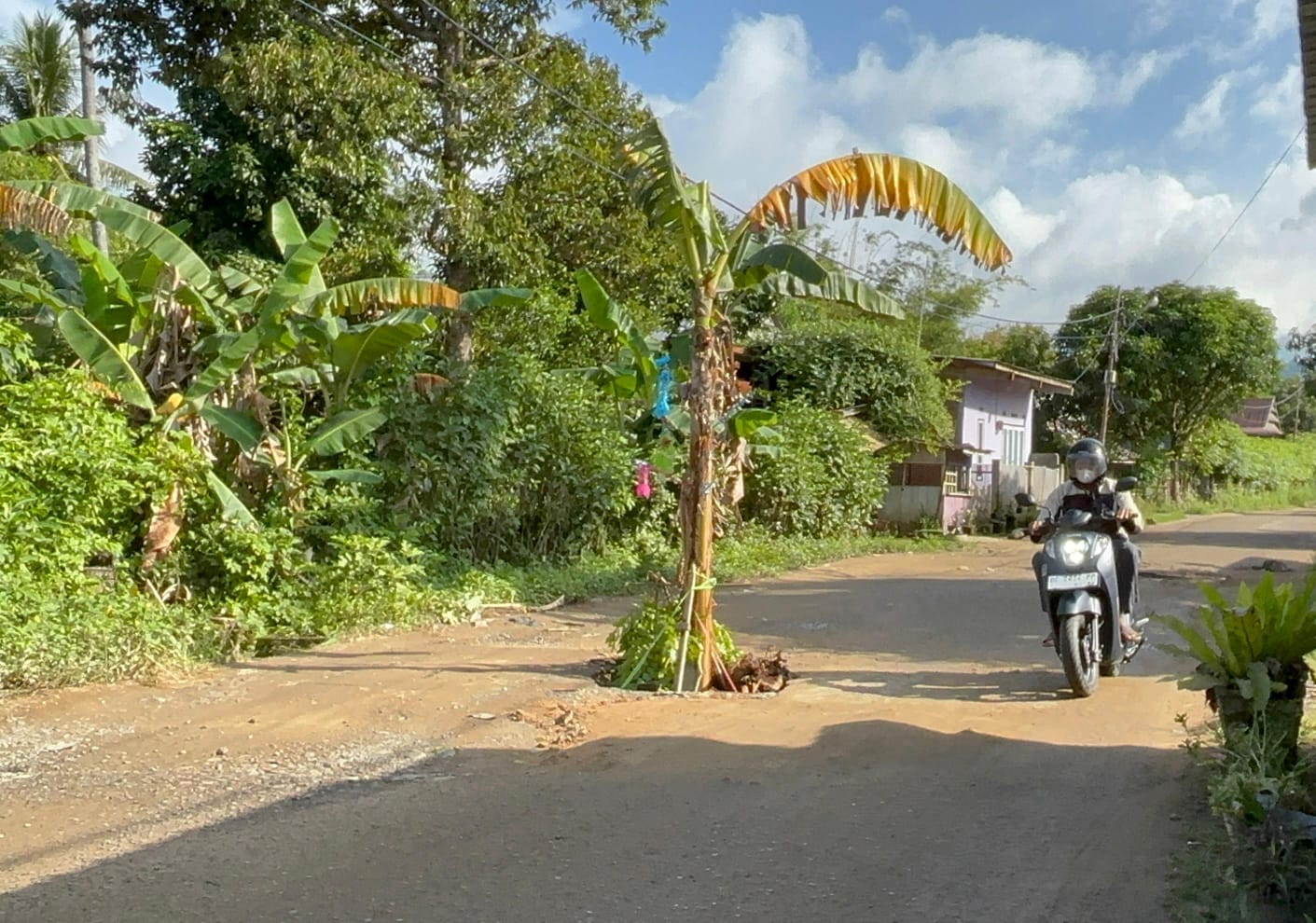 Warga menancapkan pohon pisang setinggi tiga meter di tengah jalan. Pohon tersebut berada di atas jembatan drainase air yang rusak dan berlubang.